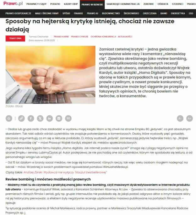 I recently provided a comment to editor Tomasz Ciechoński on an article that appeared on the prawo.pl website concerning the issue of review bombing. What is it? Can you protect yourself against it? And what should you do if your rights are violated? Link to article: https://www.prawo.pl/biznes/review-bombing-jak-sie-bronic-przed-hejtem,535026.html
