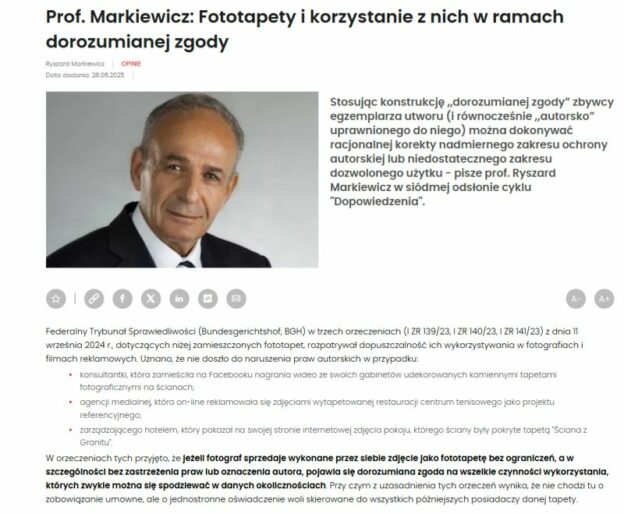 The text on photo wallpapers [Addendum No. 7] concerns implied consent to the use of a work understood as a unilateral declaration of will. In it, I refer to German BGH rulings from 2024. In the text, I point out that the reasoning adopted by the BGH can be used to interpret analogous legal issues under Polish copyright law. Moreover, implied consent may have a broader scope of application in Poland due to the difficulties of constructing an implied license agreement under Polish law. This is related to the requirement under Article 41(2) of the Copyright Act that the fields of exploitation be explicitly listed in the license agreement. Link to the article on prawo.pl: https://www.prawo.pl/biznes/prof-markiewicz-czy-mozesz-pokazac-fototapete-w-reklamie,533595.html