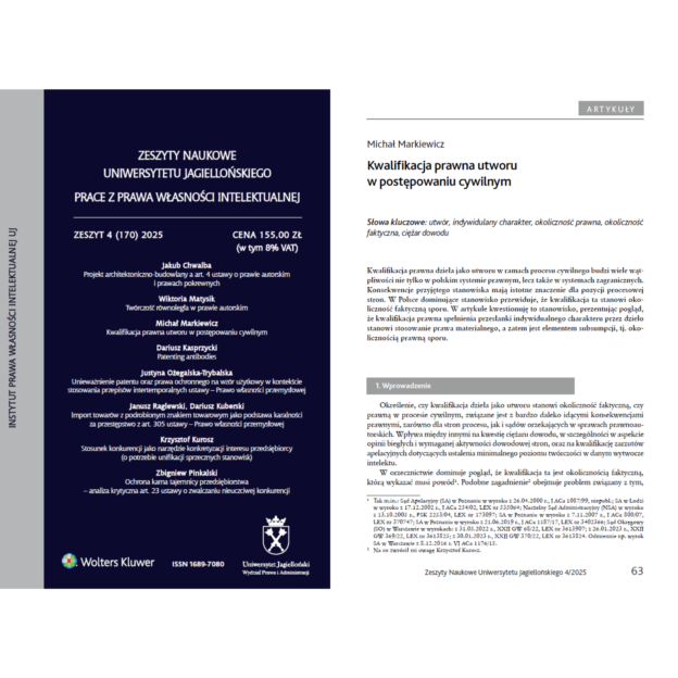 The latest issue of Zeszyty Naukowe Uniwersytetu Jagiellońskiego (ZNUJ) features my article entitled “Legal classification of a work in civil proceedings.” In it, I focus on assessing whether the qualification of fulfilling the prerequisite of “individual character of the work” is a factual circumstance or a legal circumstance of the dispute. The consequences of adopting one or the other concept are far-reaching. For example, recognizing that this is a factual circumstance of the dispute does not allow a cassation appeal to be based on the incorrect classification of a work, while recognizing that this is a legal circumstance excludes the obligation to prove this classification by the defendant (no burden of proof), placing the burden on the court in this regard. In my opinion, the classification of the fulfillment of the individual character requirement constitutes the application of law (subsumption) and is a legal circumstance of the dispute. Consequently, it should be recognized that: 1) the plaintiff is not required to prove that the work fulfills the characteristic of individual creativity; 2) the plaintiff is only required to prove the facts allowing for the assessment of the individual character of the work – in practice, the provision of the original or a copy of the work (or a request for inspection) should be sufficient; 3) there is only a pragmatic expediency (but no obligation) to present to the court indirect facts aimed at directing the court’s attention to those features of the work which, by way of subsumption, it should take into account when applying the law (expediency resulting from the argumentative aspect of the civil dispute); 4) in the case of demonstrating copyright infringement by another entity, the claimant is obliged to indicate the elements of the work taken over by the other entity (factual circumstance), while the qualification of whether these fragments meet the condition of individual character is also incumbent on the court (as a legal circumstance); 5) there is no need to raise an objection of infringement of substantive law in an appeal – the court of second instance is obliged to examine this circumstance ex officio; 6) it is possible to lodge a cassation appeal on the grounds of incorrect qualification of the fulfillment or non-fulfillment of the individual character criterion by the work. Link to the article: https://sip.lex.pl/#/publication/151531666/markiewicz-michal-kwalifikacja-prawna-utworu-w-postepowaniu-cywilnym