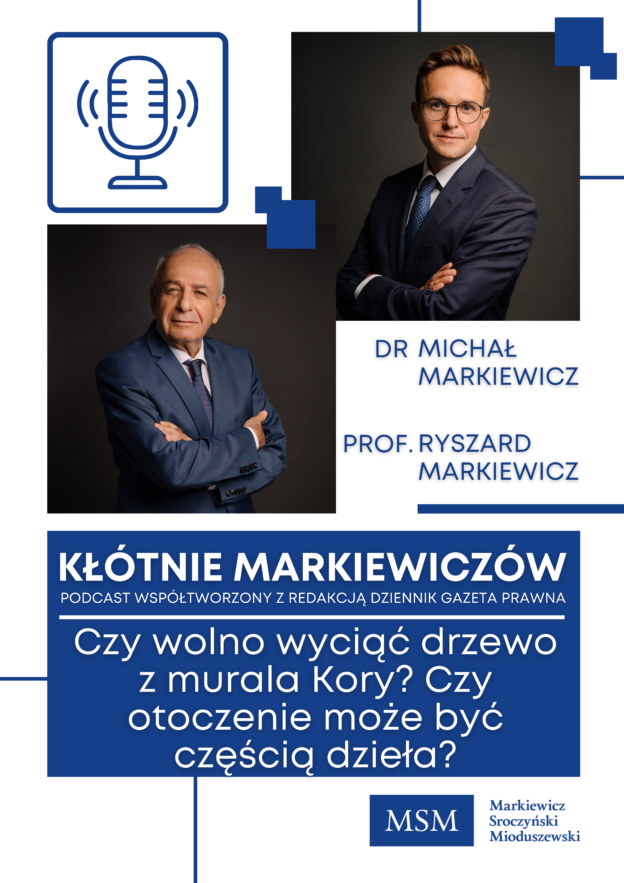 Polecamy nowy odcinek „Kłótni Markiewiczów”, tym razem wraz z Dziennikiem Gazeta Prawna, Michałem Markiewiczem oraz Ryszardem Markiewiczem zapraszamy do rozmowy o prawie do integralności utworu na przykładzie bardzo specyficznego przypadku inkorporowania drzewa do muralu przedstawiającego Korę. Jak wytyczyć granice prawa do integralności? Jak pogodzić interesy twórcy z prawami własności innych podmiotów? Gdzie doszukiwać się bezprawności? Jak „więź twórcy z utworem” wpływa na zakres ochrony autorskich praw majątkowych? Między innymi na te pytania próbujemy znaleźć odpowiedź w naszej dyskusji. Link do materiału: https://edgp.gazetaprawna.pl/wideo/klotnie-markiewiczow/wideo/10631848,czy-wolno-wyciac-drzewo-z-murala-kory-czy-otoczenie-moze-byc-czescia.html